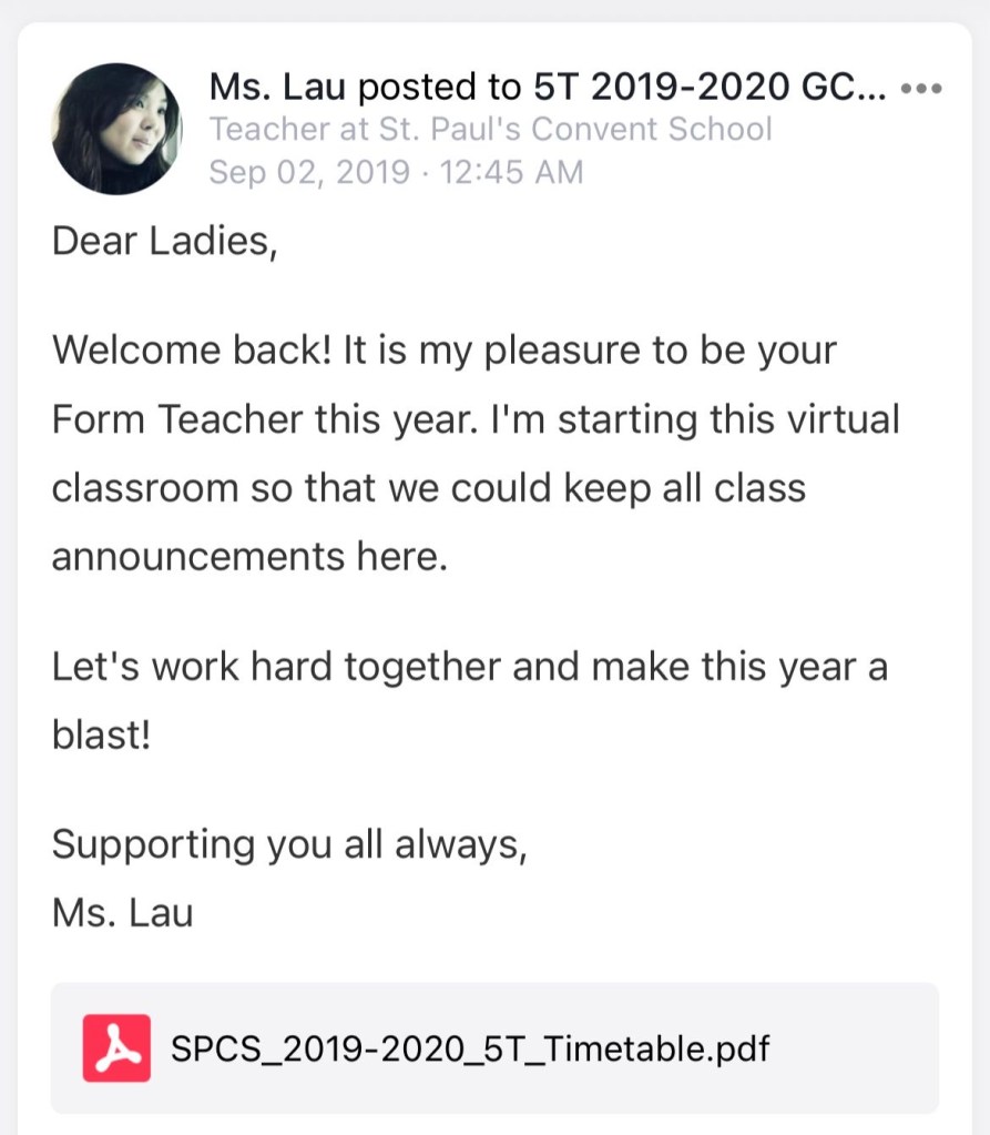 Natalie: Yes, despite the fact that she had to leave our class for a while, she kept us all in her heart. I recall vividly by the time she returned to Hong Kong in September, she bought each of us a souvenir from Seoul – a cartoon themed folder. She even shared a photo of the entire souvenir collection she got for us with me and Anson. I still remember clearly that the souvenirs were all nicely displayed on her hotel bed. I was amazed at her kindness and love for us, given that she had just been our class mistress for a month and we weren’t even that close.