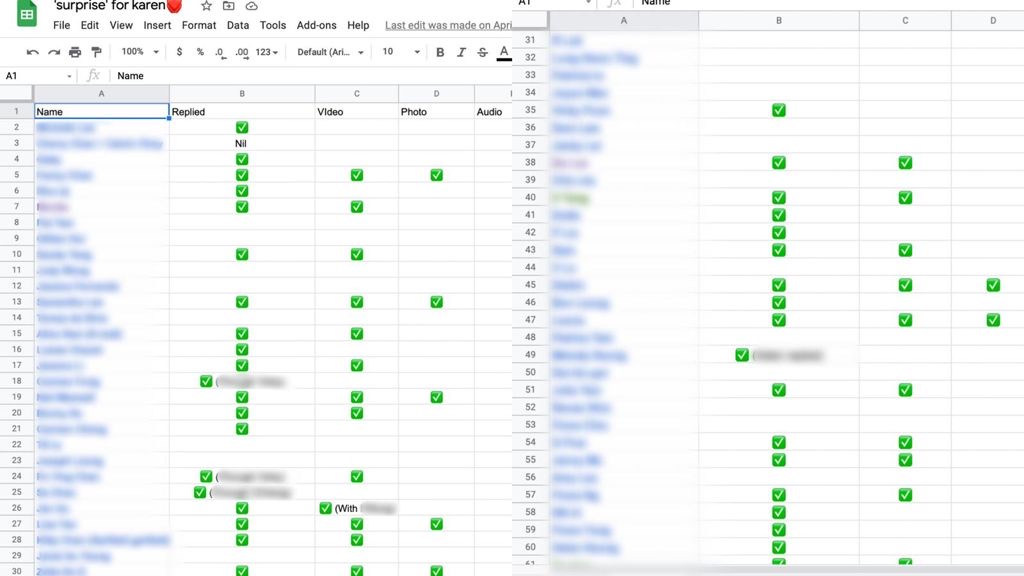 Another big surprise was successfully held. Anson and Natalie rounded up over a hundred of Karen’s friends (including those from childhood, school, law, mediation and arbitration, as well as both former and current students) to film a short video to support Karen. They planned for it to be an anniversary gift (a year of battle with sarcoma) on 22 May, but upon seeing Karen’s deterioration, they needed to speed up the production process. Everyone submitted their parts promptly and it really showed how much they cared. Anson and Natalie asked Karen’s family to play her the video while she was at the hospital, a few days before she passed on 9 May. Thankfully, the video was made and presented in time.