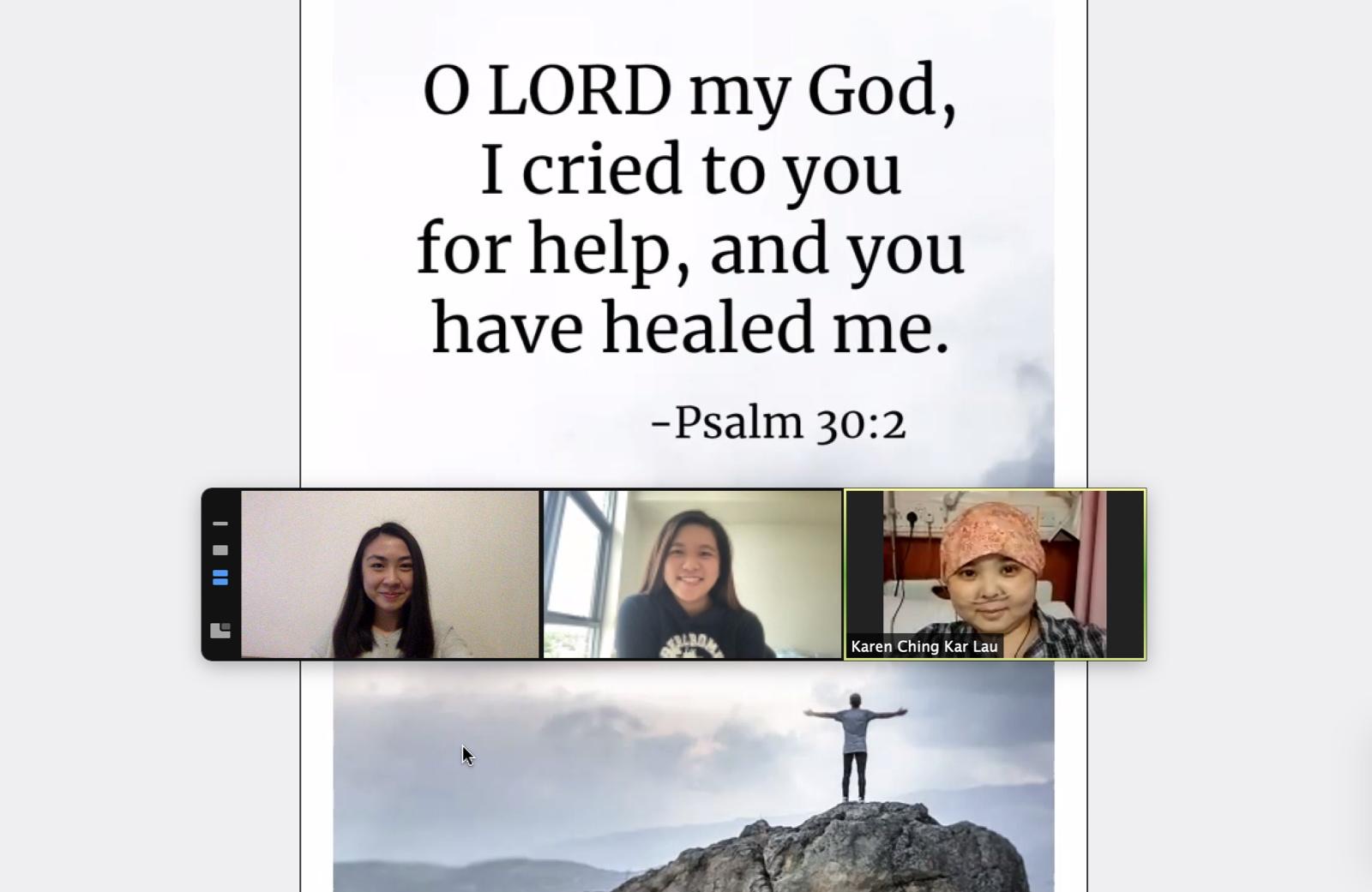 Anson: Honestly, Karen opened up to me first. Just before the Zoom surprise, I started speaking to Karen more frequently because I wanted to care for her given her situation, such as by asking about her treatment process and if the videos I sent her were helpful. One morning, I received some messages at 7AM (Sydney time), and I wondered who sent them as my UK and Hong Kong friends don’t normally text me at such an early/late time. It turned out to be Karen and I wondered why she’d reply at 4AM (Hong Kong time). I don’t know why, but I already felt that those messages were extraordinarily precious, they seemed like something I must treasure within a limited time, so I chose to check them even when I was barely awake. To my surprise, she recorded a 10-minute voice message detailing the first day she discovered her cancer up till the day she sent the audio. And for the first time upon hearing her personal account, I cried. She said she was up early as she had to prepare for radiotherapy that day. I was really touched by how much she trusted me and opened up to me, and ever since, I have gradually talked to her more and spent more time with her. When she explained how the tumours spread in her body, the impact of listening to these words come from herself was overwhelming. It’s like those medical terms and devastating scans that I used to learn from the case studies in university (which I often found to be foreign and distant, or even fictional – cases made up by professors), was actually happening to someone I know, it honestly didn’t feel good. While I was thankful that she trusted me with her condition, I was also terrified for her (even though she didn’t really show her fear, or at least tried to downplay the dread so that she wouldn’t affect me). What felt worse was the fact that she was someone I personally know and admire. This kind of sharing from a stranger is impactful enough, but when it comes from someone you know, let alone someone close, the effect is so much greater.