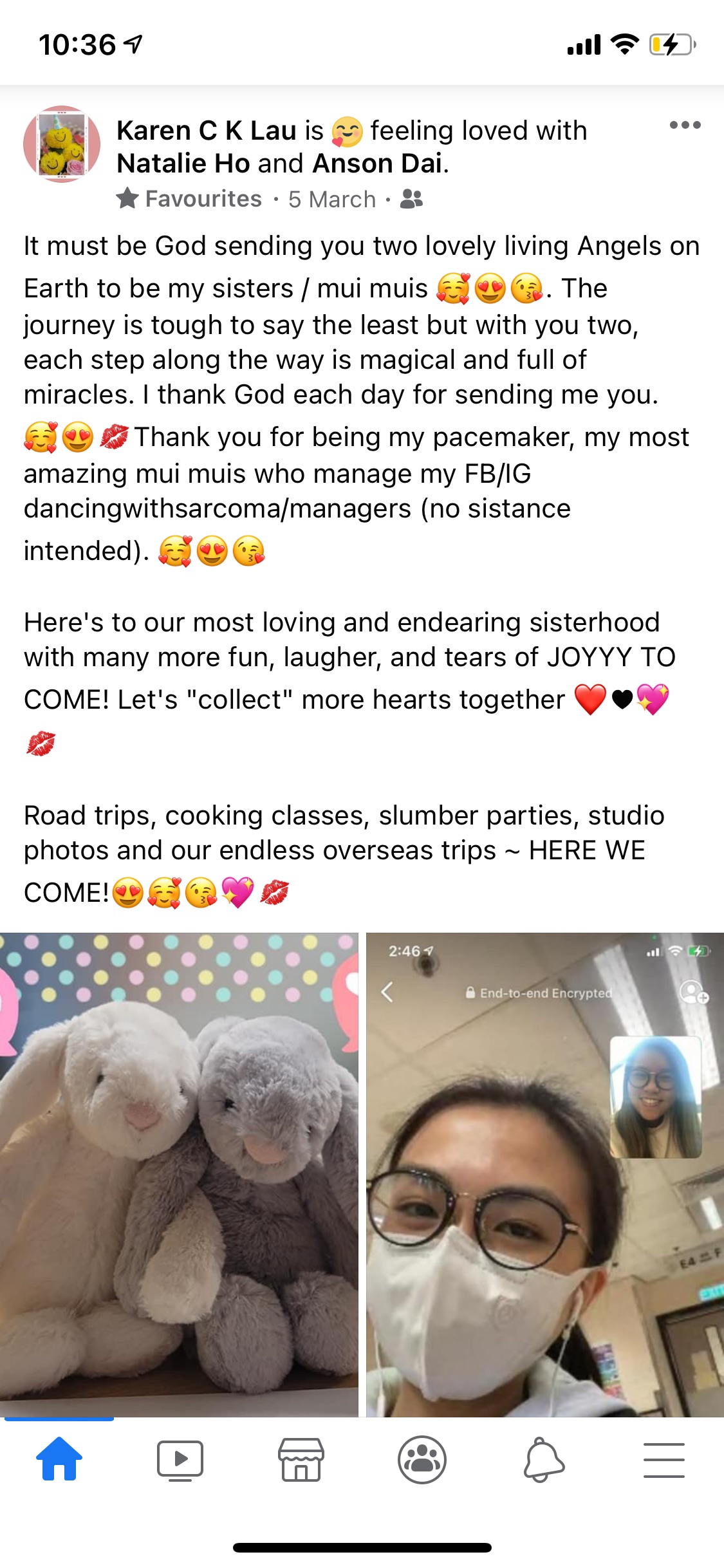 Anson: Karen also sent us photos of her makeup collection to teach us how to put on makeup. During our calls, we would also play with these funny filters, it was silly but it was really helpful during those stressful days. The three of us even had matching earrings and pajamas too, and we would wear them to symbolise how we are always close at heart even though we are physically miles apart. Natalie and I knew that we couldn’t be by her side most of the time, so we bought 2 bunnies (Jellycat toys) that represented us, to keep her company. Karen named them “Ching Ching” and “Kar Kar” (the two characters of her Chinese name). She also made her first ever post about us too. And Karen always made future plans with us, like going on trips and taking studio photos. We couldn’t wait for them to actualise, so we prayed hard for her recovery.